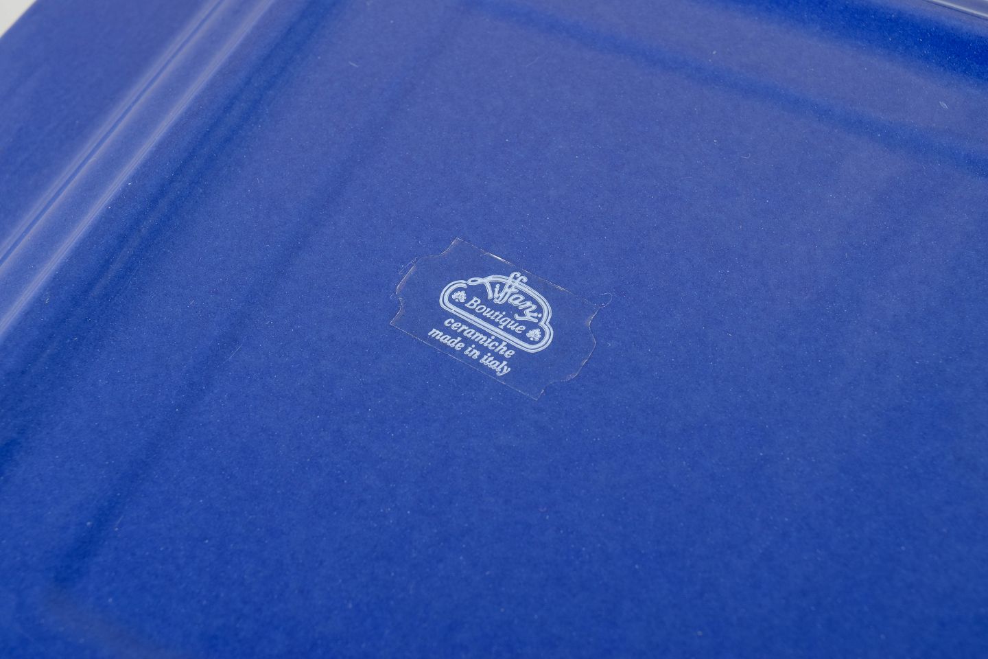 Enkelt og elegant sæt i keramik bestående af tre store firkantede tallerkner med ensartet dyb blå glasur.