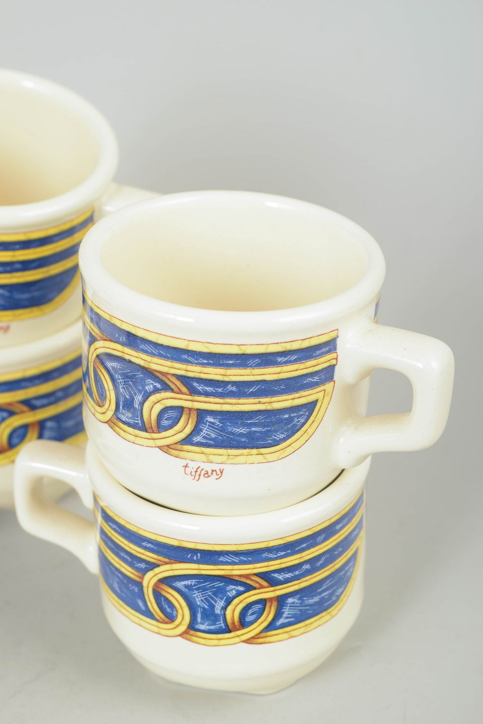 Text zugänglich auf Dänische: Tiffany Boutique, sæt af fire espressokopper med underkopper.