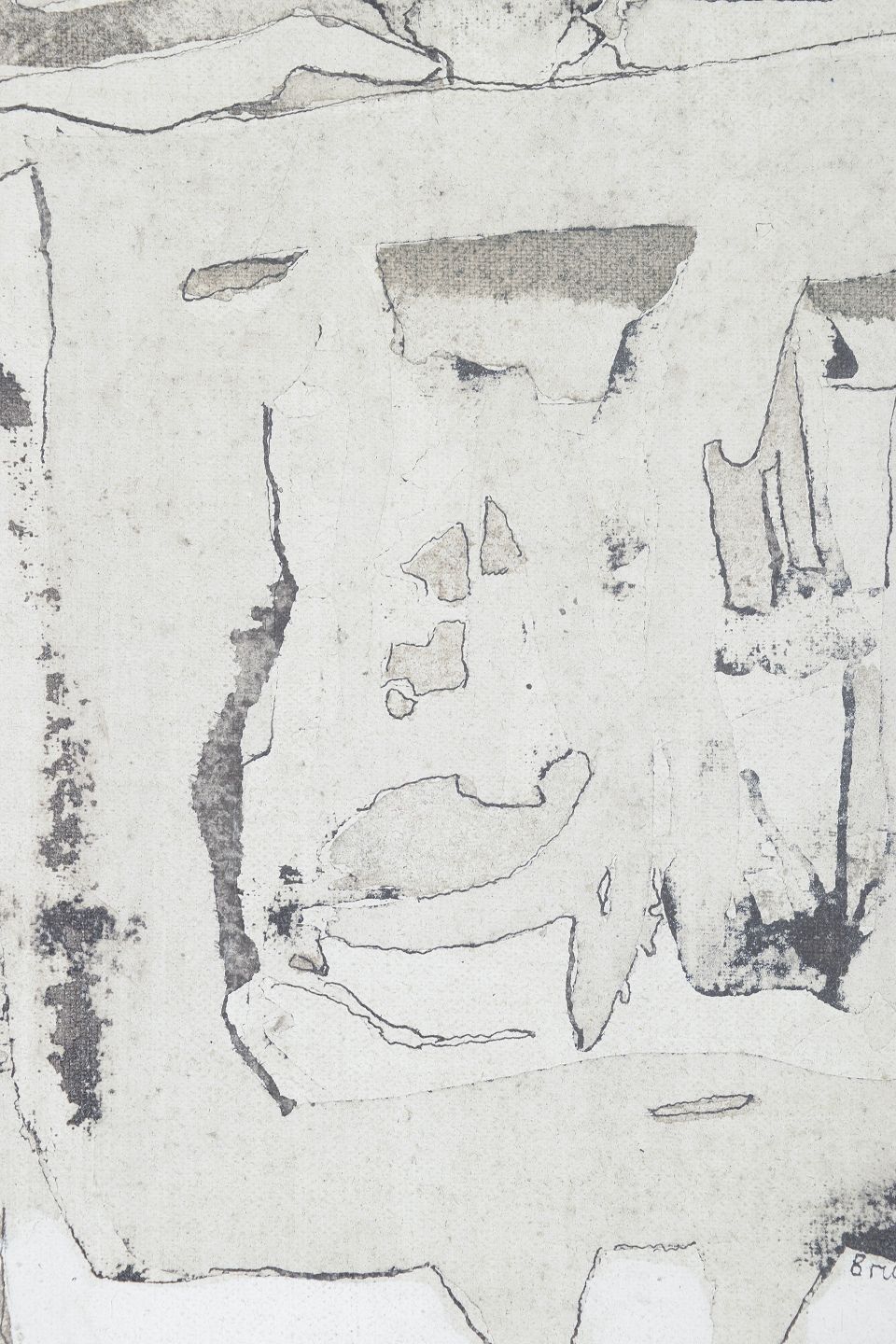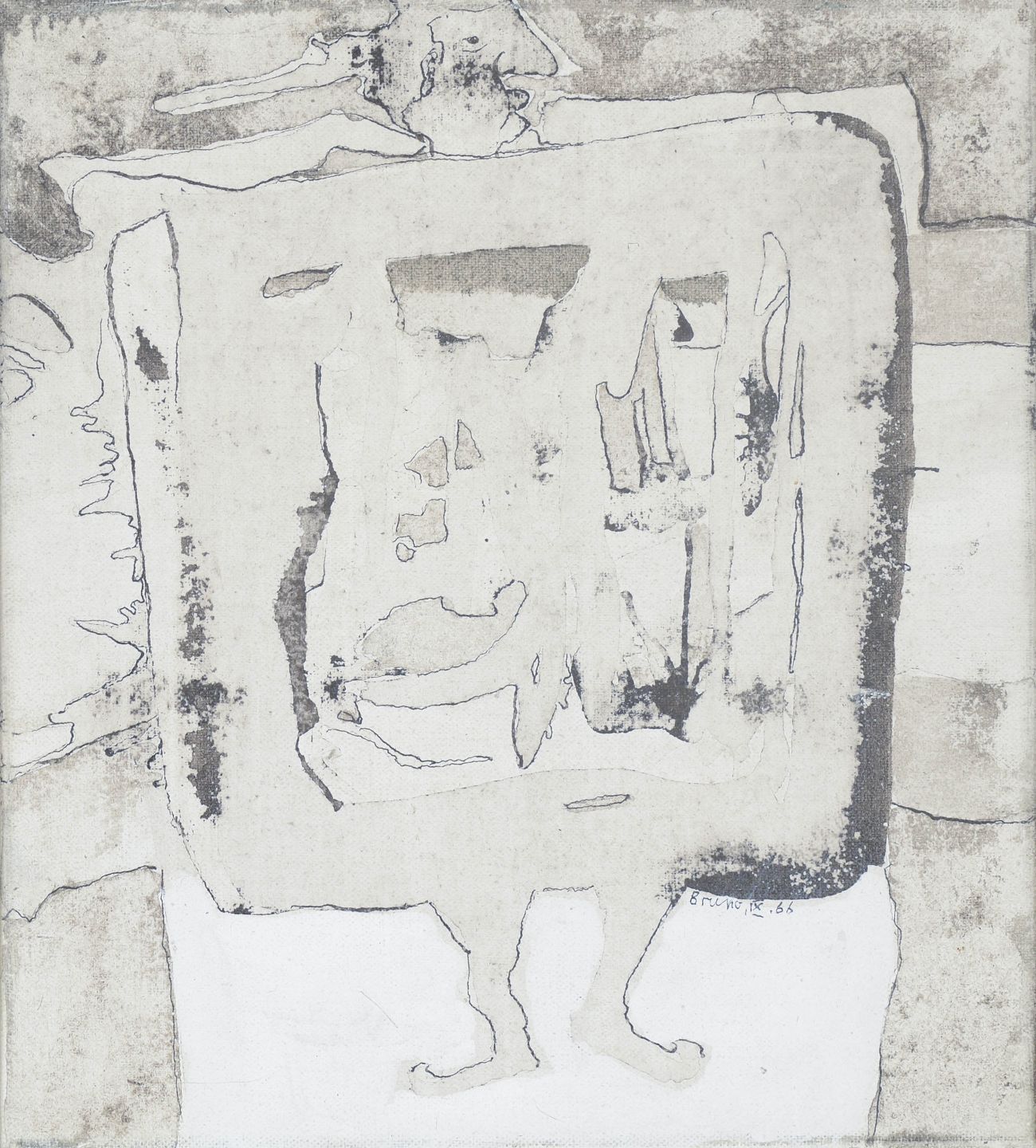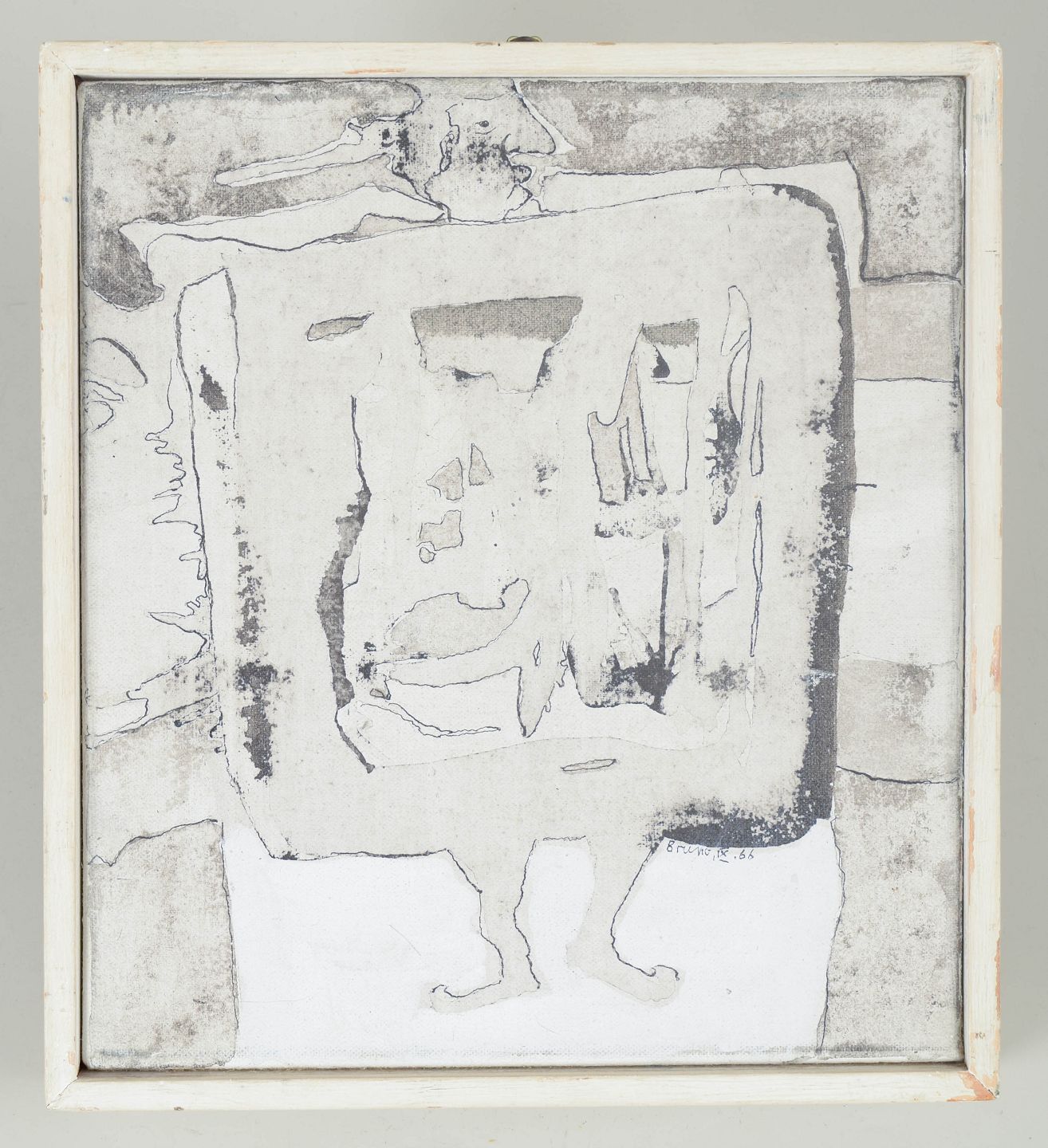 Abstrakt komposition udført i olie på lærred med afdæmpede gråtoner og organiske former. Signeret Bruno 66.