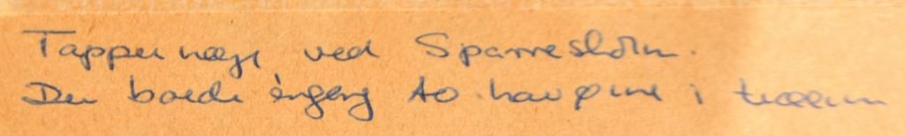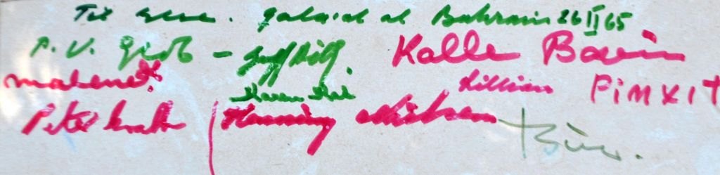 Rückseitentext: An Else - Qala'at al Bahrain 26 II 65 - und alle handschriftlichen Unterschriften der Stifter: Kalle Bovin (Pinxit), PV Glob, Geoffrey Bibby (Mitleiter der Expeditionen in den Golf. Ursprünglich ein englischer Archäologe, wohnhaft in Aarhus), Malene (damals Malene Møller Jensen - jetzt Malene Ravn, Architekturstudentin und Ausgräberin), Karen Kat (Karen Frifeldt, Archäologin und eine der erfahrenen Teilnehmerinnen der Expeditionen. Wurde manchmal Karen Kat genannt), Lilliana (verheiratet mit Bue, "Hausfrau" der Expedition), Peter Crabb (Archäologe), Henning Nielsen (Archäologe - möglicherweise Student) und Bue (verheiratet mit Lillian, vollständiger Name Svend Bue Madsen, Amateurarchäologe aus Nordseeland, Teil der Expedition).