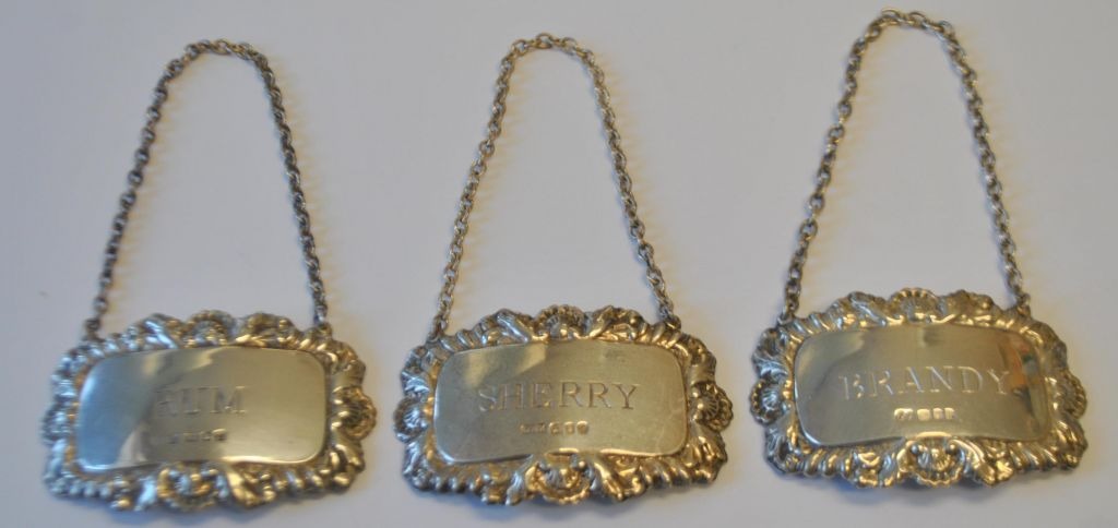 Silber Weinschilder, England, 19. Jahrhundert. Schilder für Rum, Sherry und Cognac. Gestempelt. Mit Kette und Randverzierung. 4 x 6,2 cm.