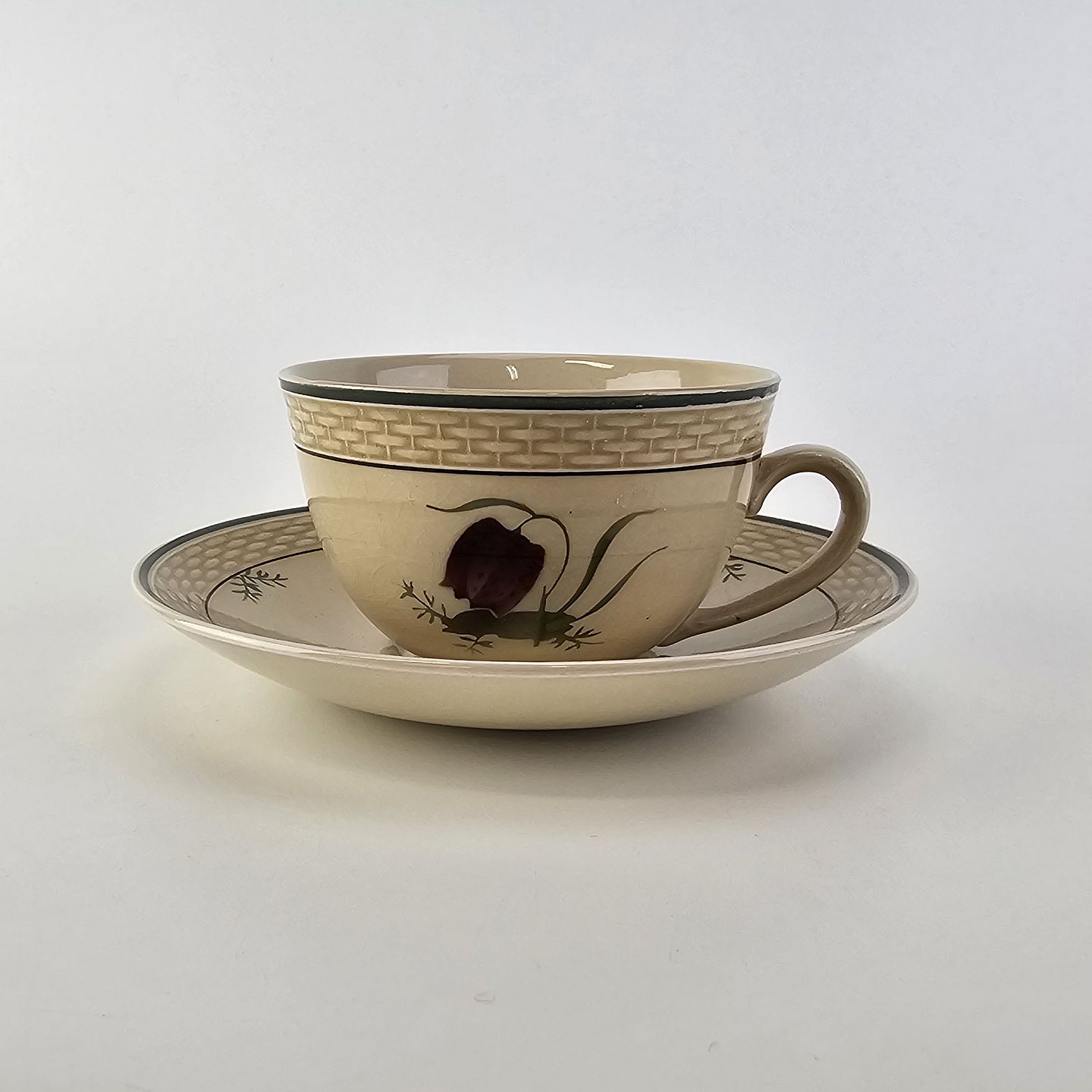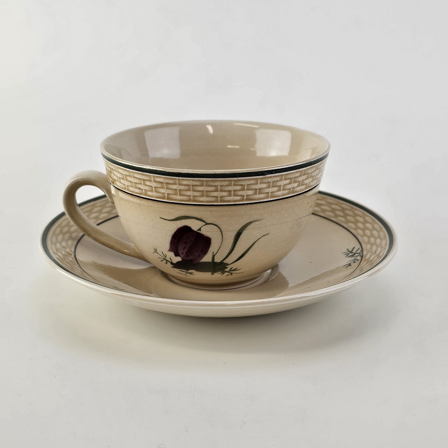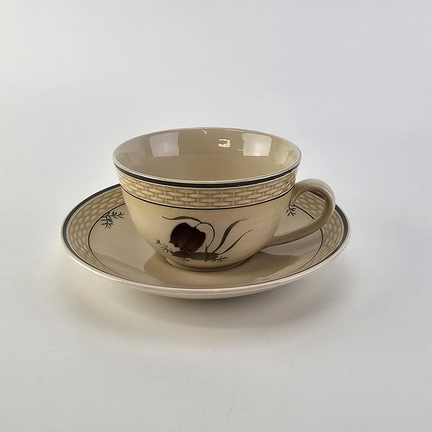Tekop med underkop i fajance fra stellet Vibeæg