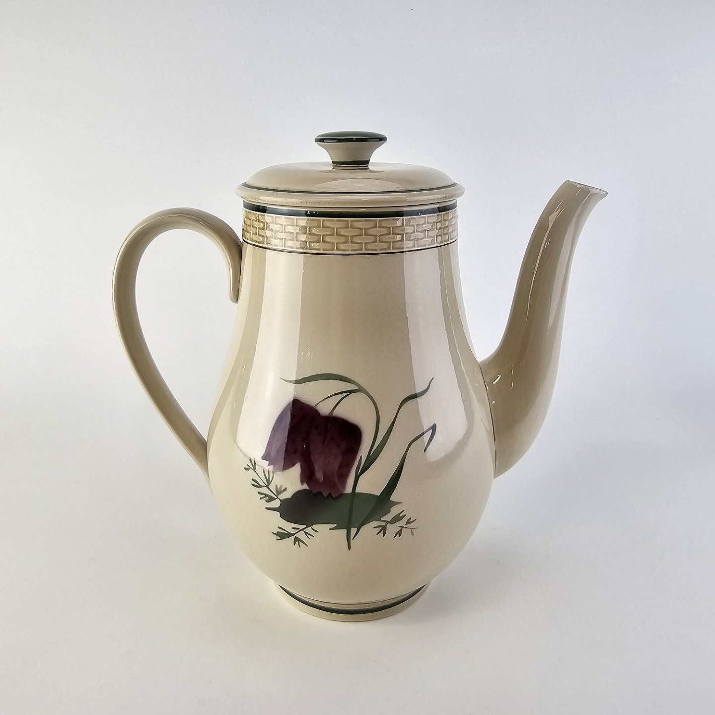 Fajancestel i stelform Viktoria II (Fletværk) med flettet kant og dekoration af en vibeæg blomst i violet og grøn, fremstillet i perioden 1934-1967