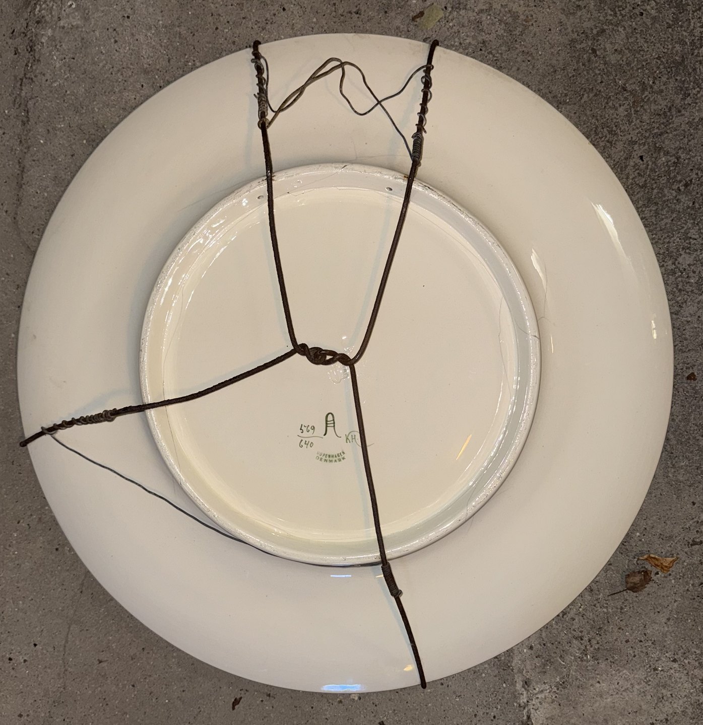 Stort fajancefad fra Aluminia, dekoreret af Christian Joachim med et motiv af en guldfasan omgivet af blomster og blade. Fabriksmærket på bagsiden. Som det fremgår af fotos er der flere revner efter skade på fadet. Mål: Ø. 45,5 cm FORSENDELSE IKKE MULIG - SKAL AFHENTES PÅ FREDERIKSBERG