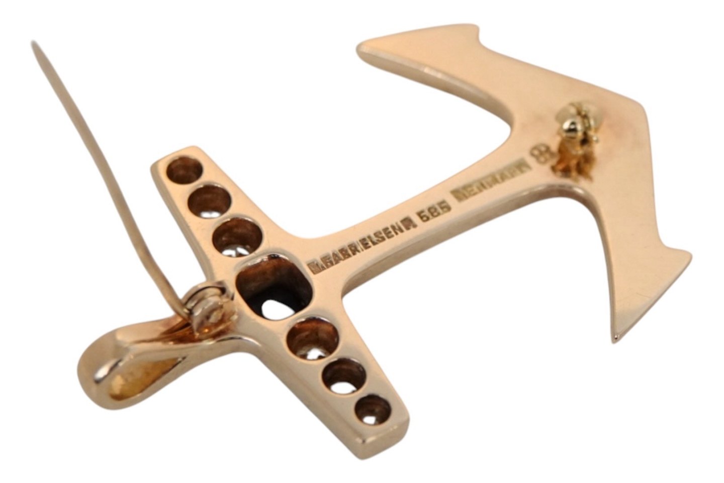 Bent Gabrielsen 14 karat guld stort vedhæng i form af anker med en ret stor blå safir og seks store safirer. Smykket er udført i en lækker tung kvalitet. Smykket kan både benyttes som en broche samt et vedhæng, da der både er øje til kæde samt nål.
