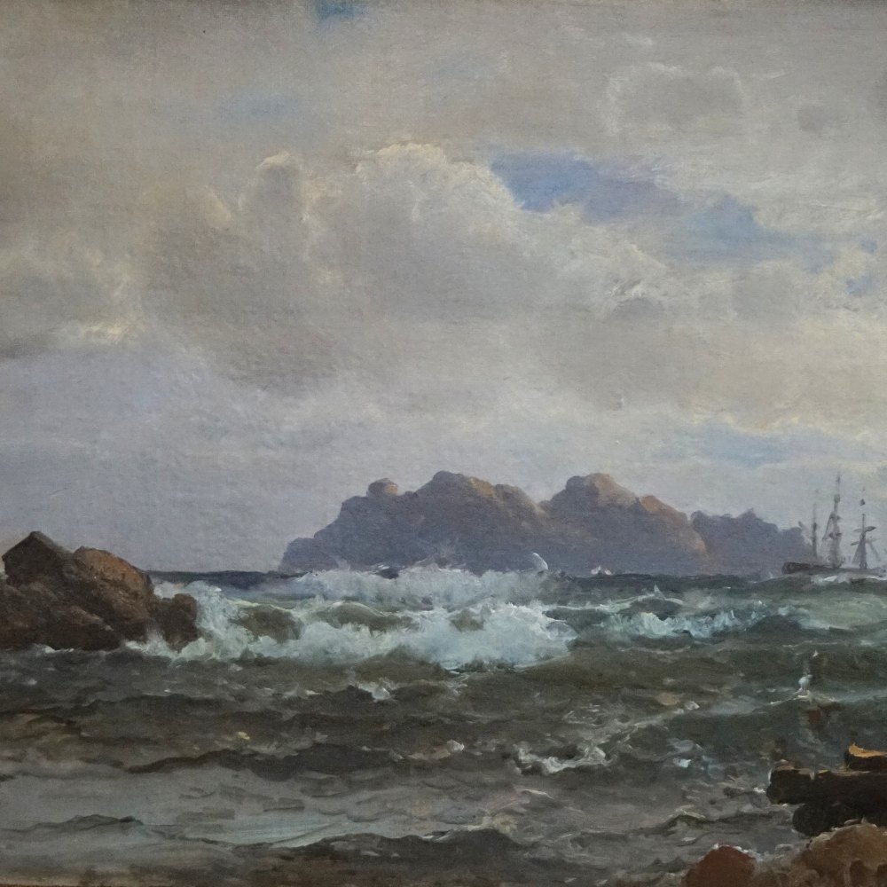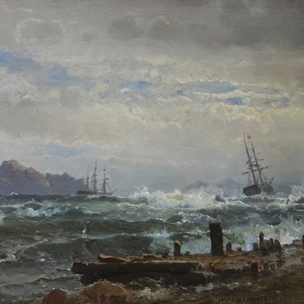 Text zugänglich auf Dänische: Mariner maleri af Carl Frederik Sørensen, motiv ved Mandal i Norge, juli 1873. Olie på lærred. Signeret "C. F. Sørensen" derudover indridset "Mandal Norge juli 1973".