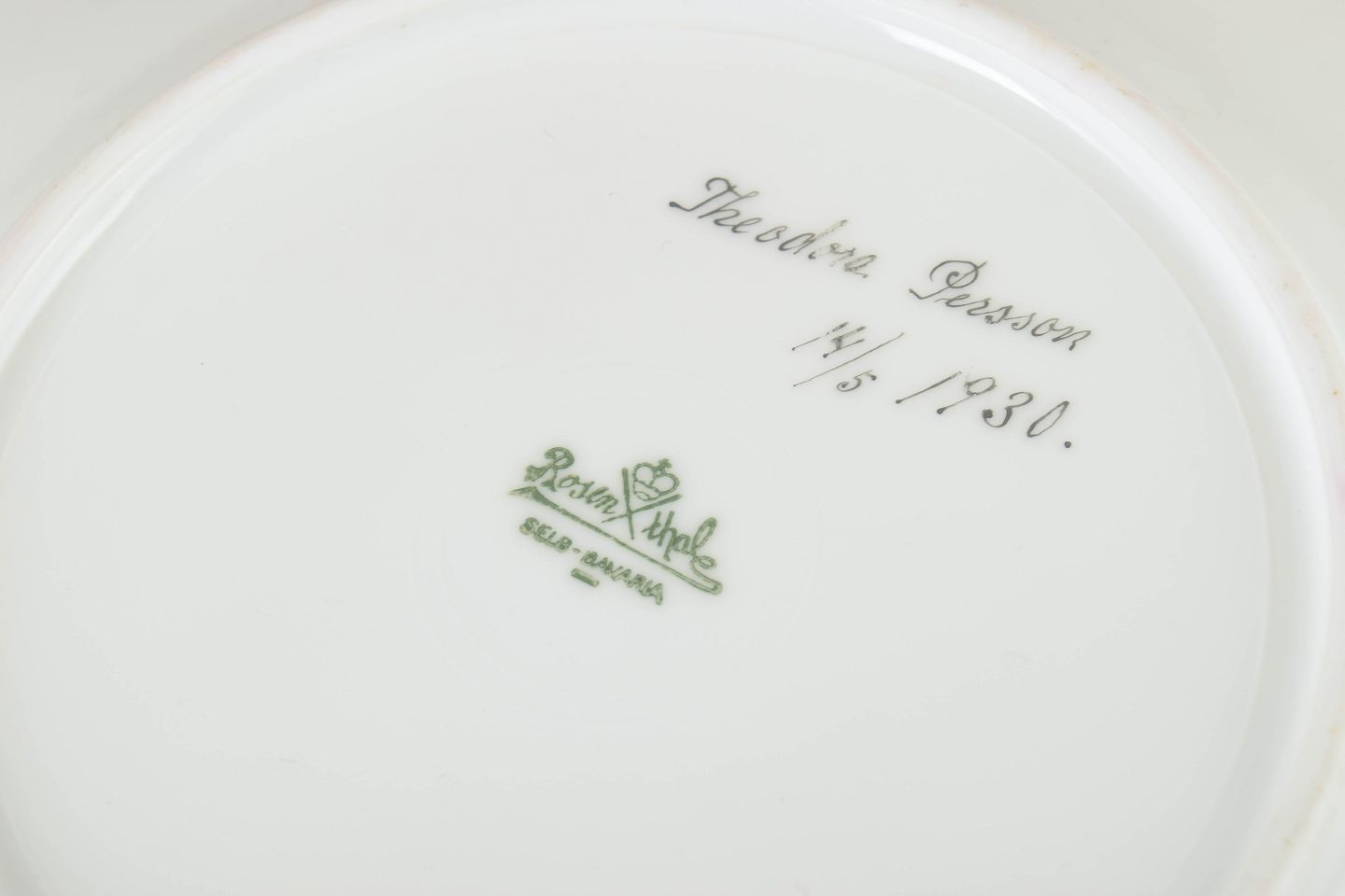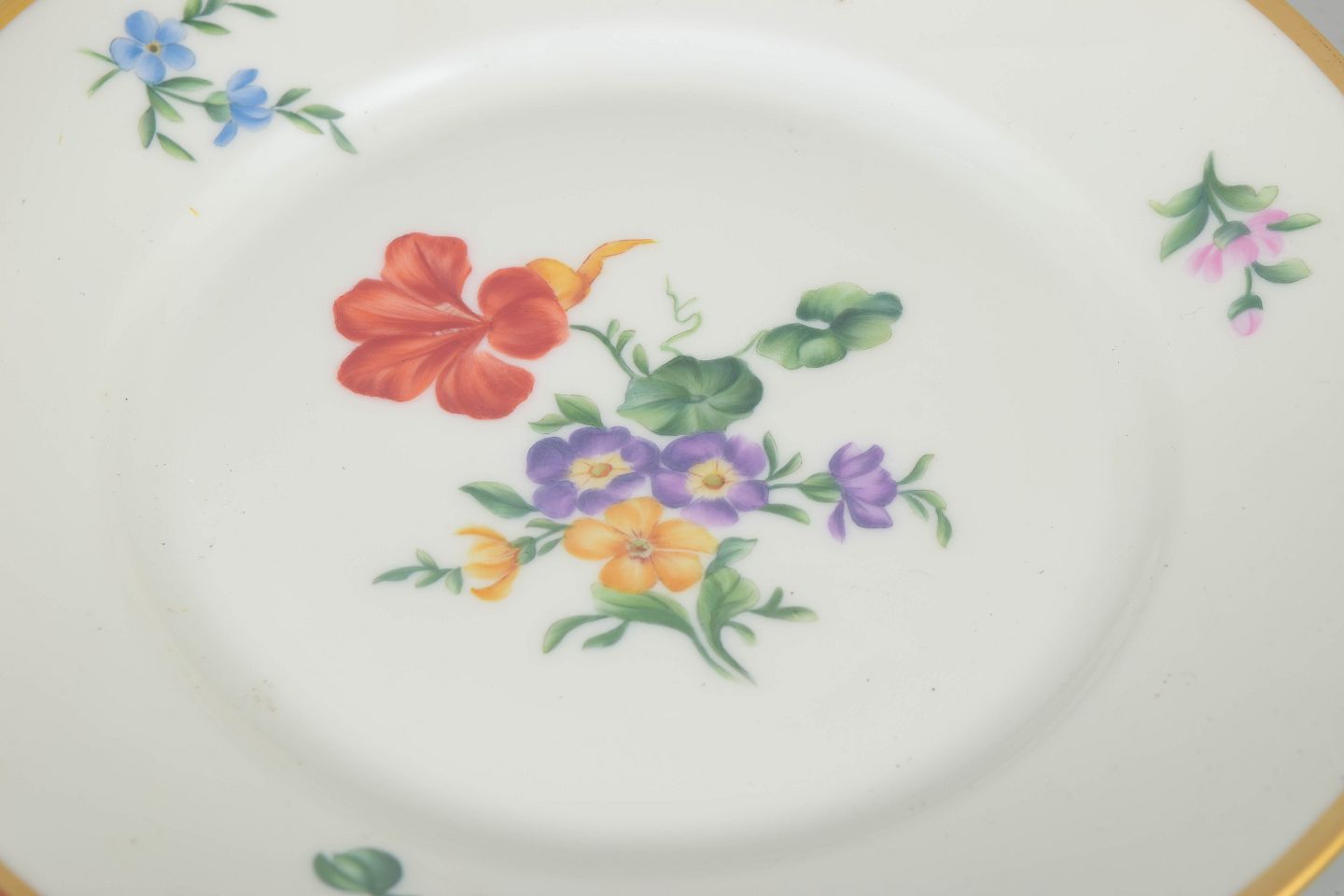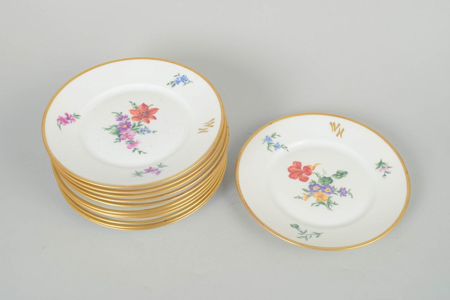 Elegant sæt af tolv porcelænstallerkener med polykrom blomsterdekoration og forgyldt kant, produceret af Rosenthal i 1930’erne. Klassisk tysk porcelæn med raffineret håndværk og dekorativt udtryk. Privatdekoreret.