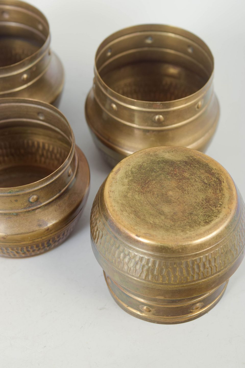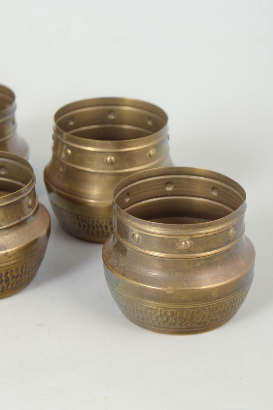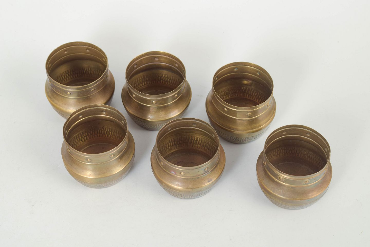 Ensamling af seks mindre bægre i messing med enkel cylindrisk form, fremstillet i skandinavisk designtradition fra midten af det 20. århundrede.