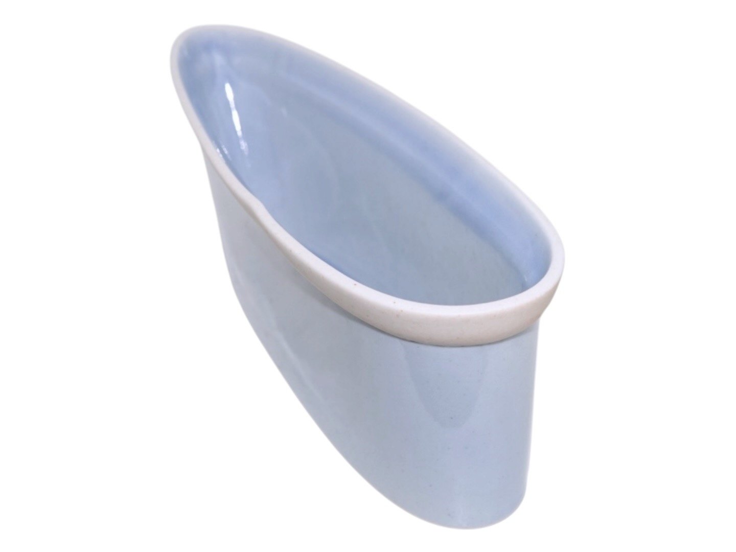 Bodil Manz keramik, bådformet lyseblå skål med hvid stribe.