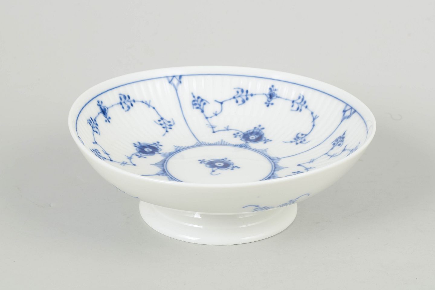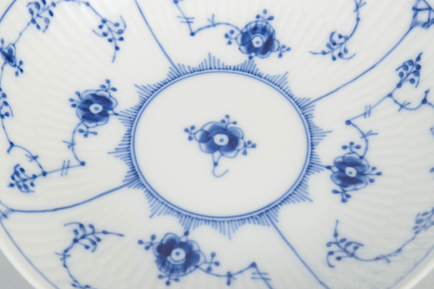 Klassisk opsats i Royal Copenhagens Musselmalet Riflet stel, model 1/18, udført i håndmalet porcelæn med det ikoniske blå dekorerede mønster. Eksemplaret er 4. sortering med tre gennemstregede linjer fra 1970’erne.