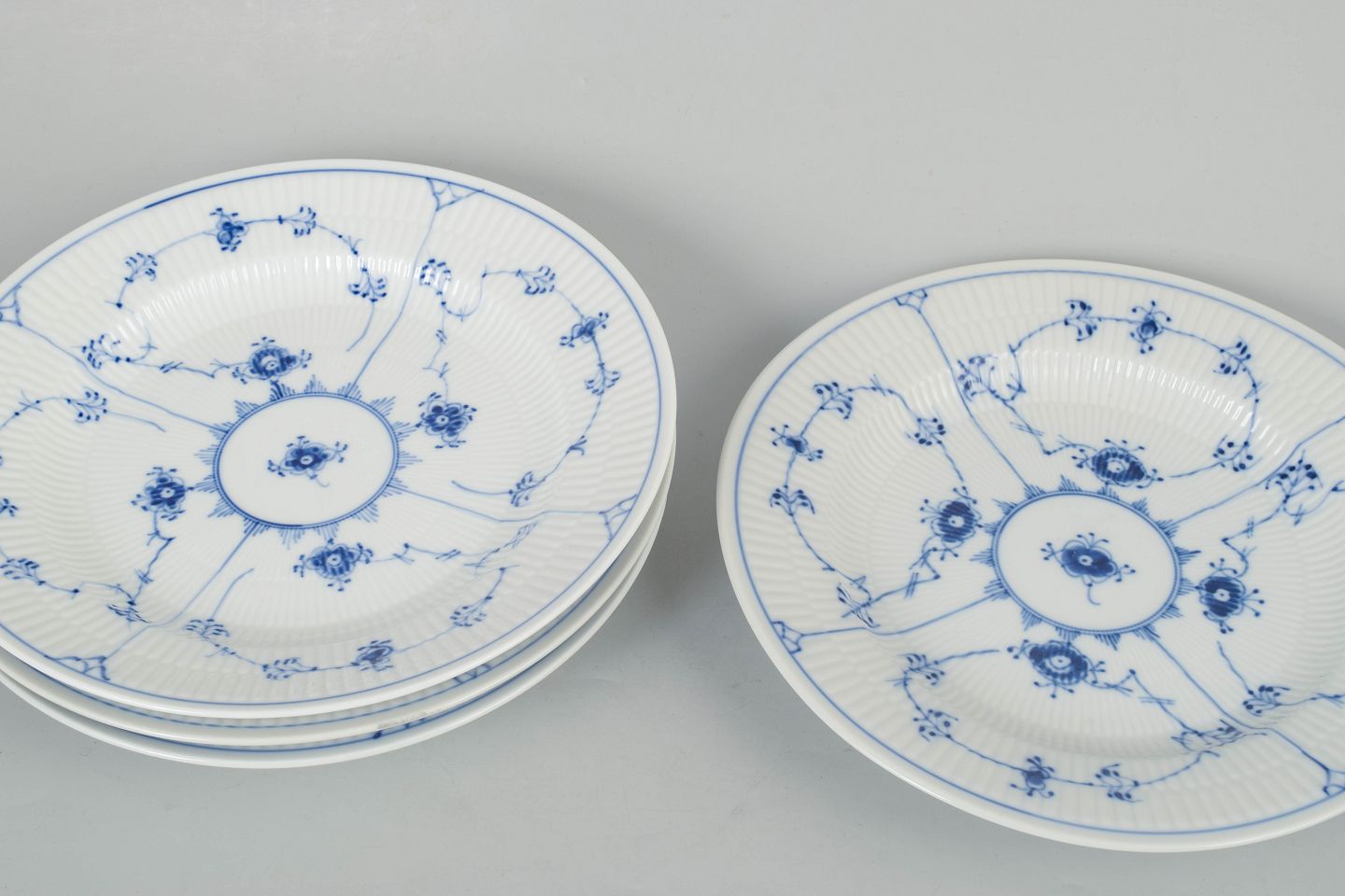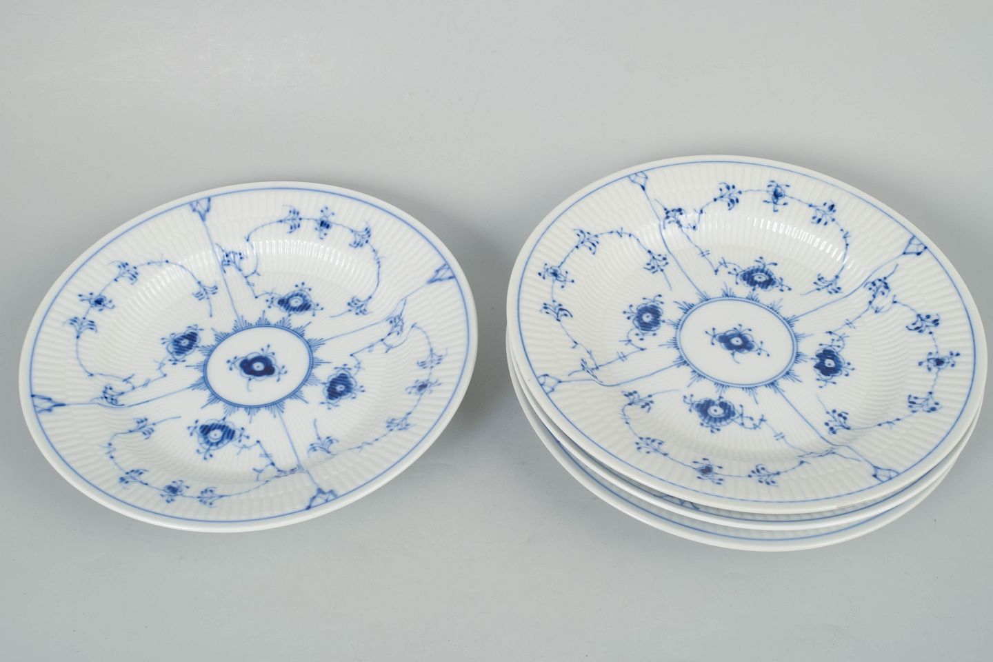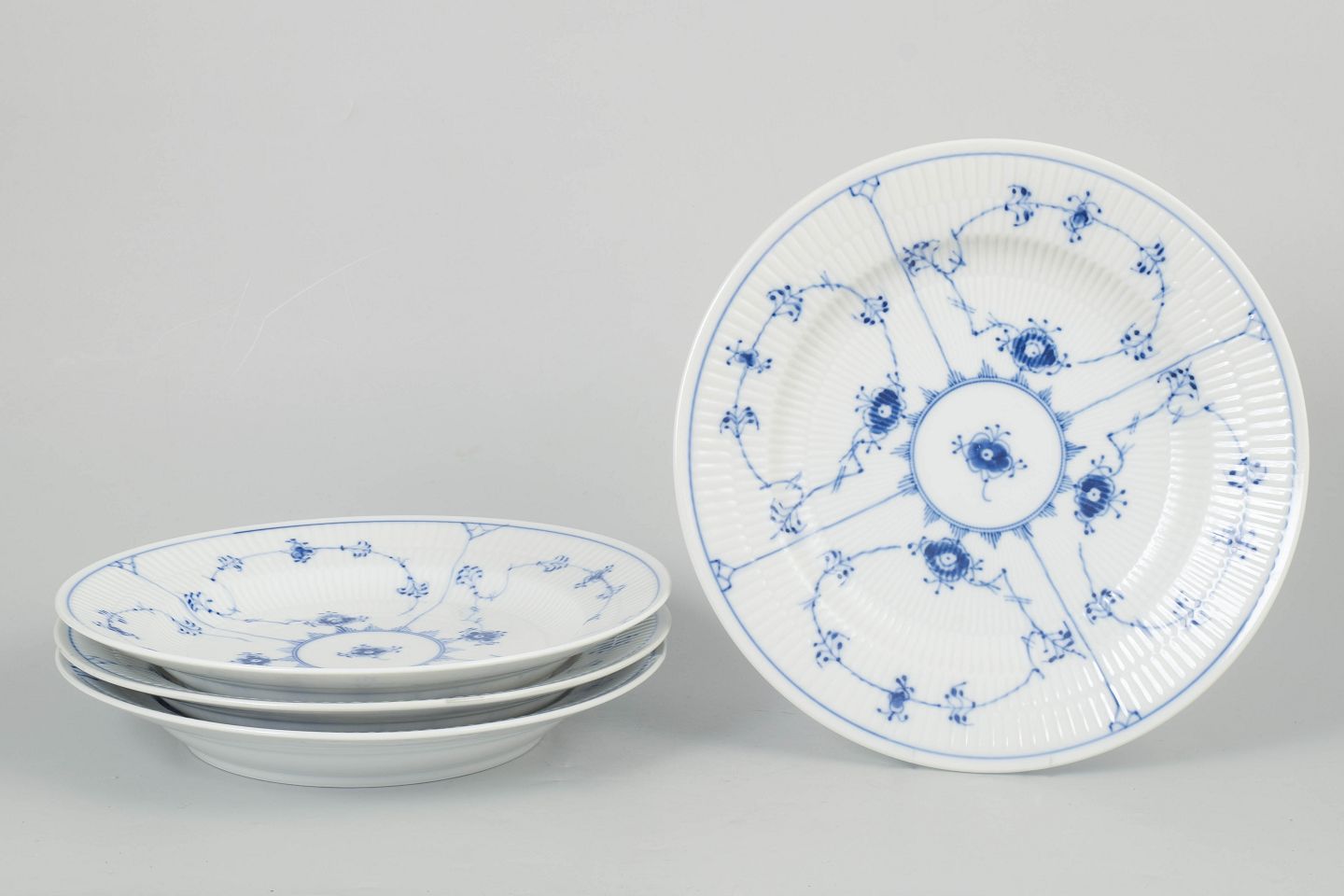 Text zugänglich auf Dänische: Royal Copenhagen Musselmalet Riflet, sæt af fire middagstallerkener.