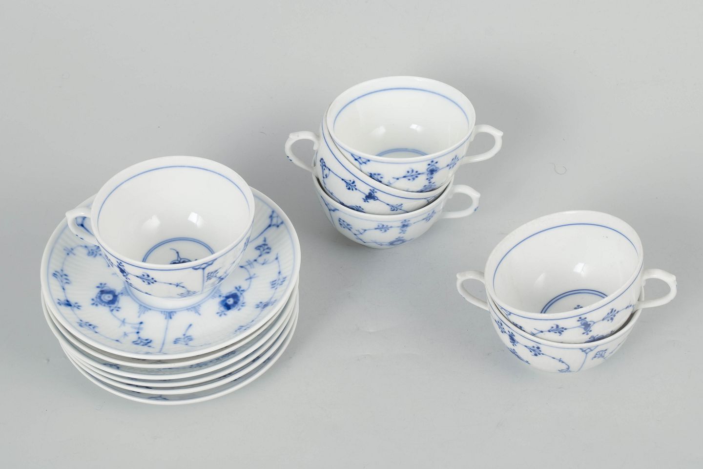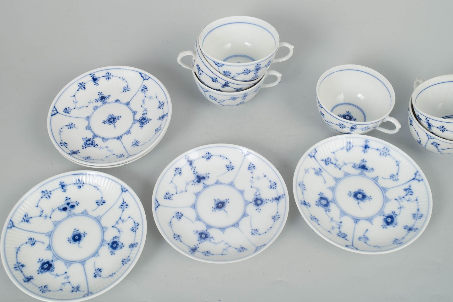 Text zugänglich auf Dänische: Royal Copenhagen Musselmalet Riflet, sæt af seks kaffekopper med underkopper.