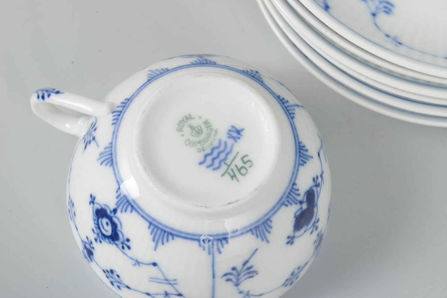 Klassisk sæt af seks kaffekopper med matchende underkopper i Royal Copenhagens Musselmalet Riflet stel, model 1/465, udført i håndmalet porcelæn med det ikoniske blå dekorerede mønster. Alle dele er 1. sortering og spænder fra tidligt 20. århundrede til 1980’erne.
