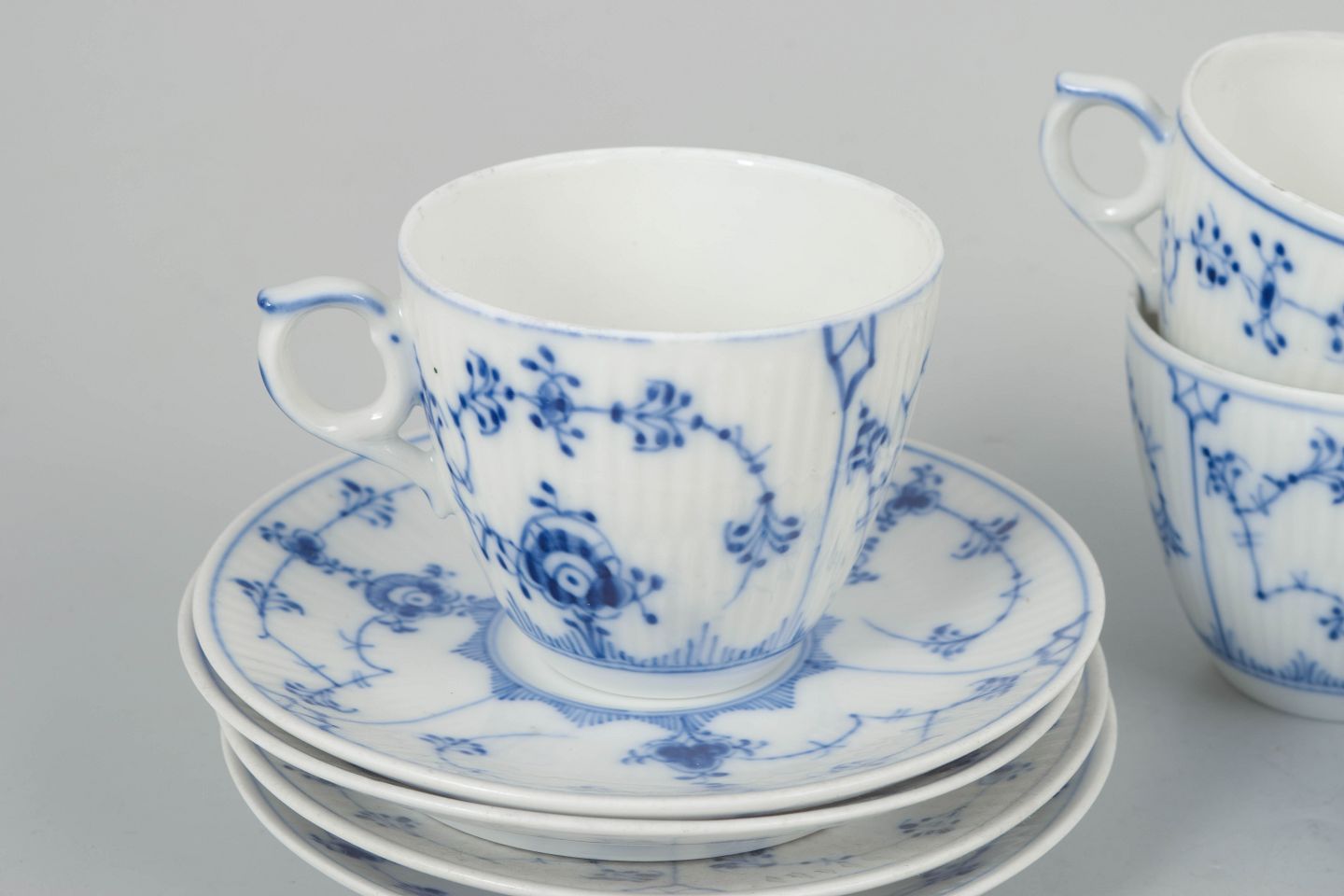 Royal Copenhagen Musselmalet Riflet, sæt af fire kaffekopper med underkopper.
