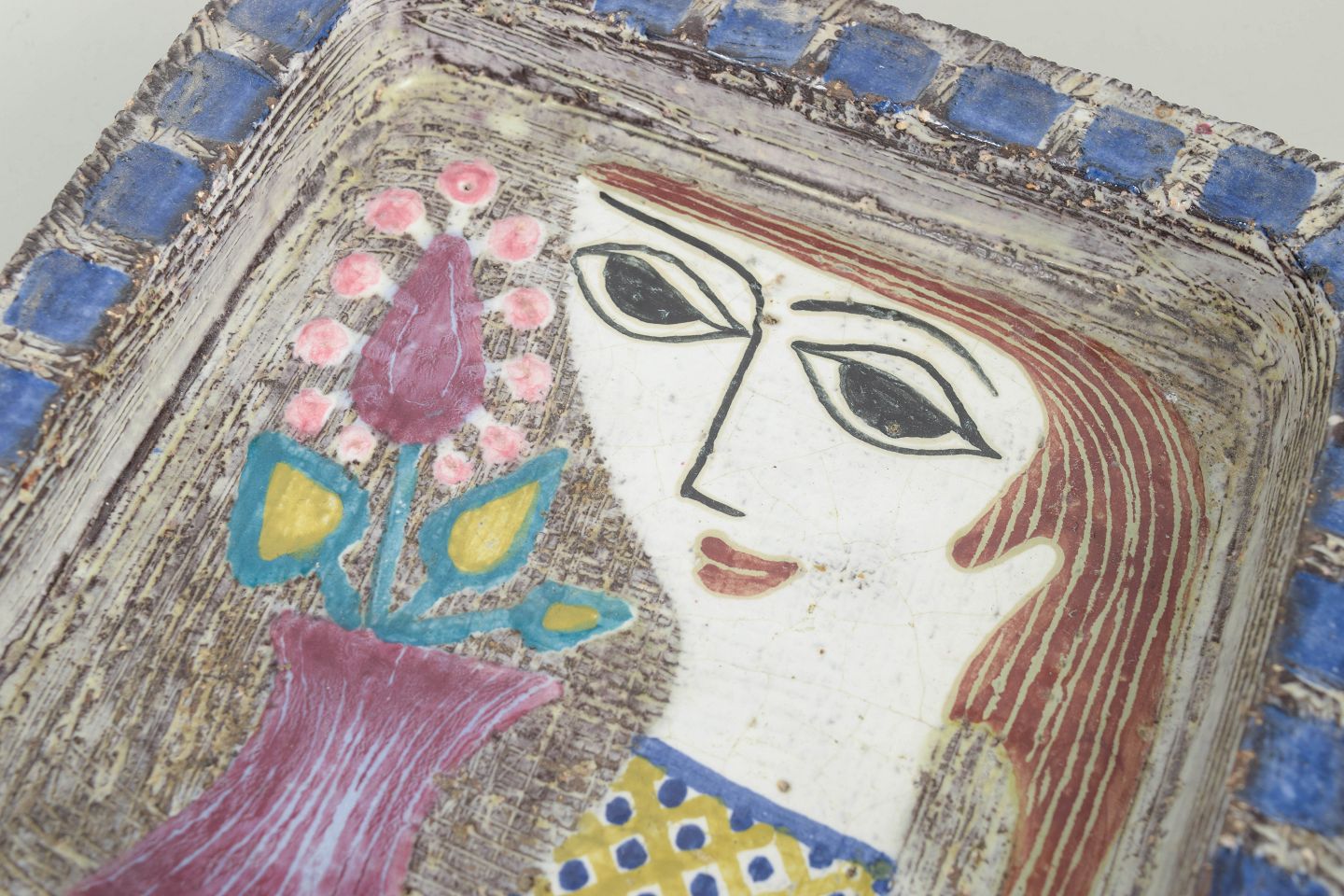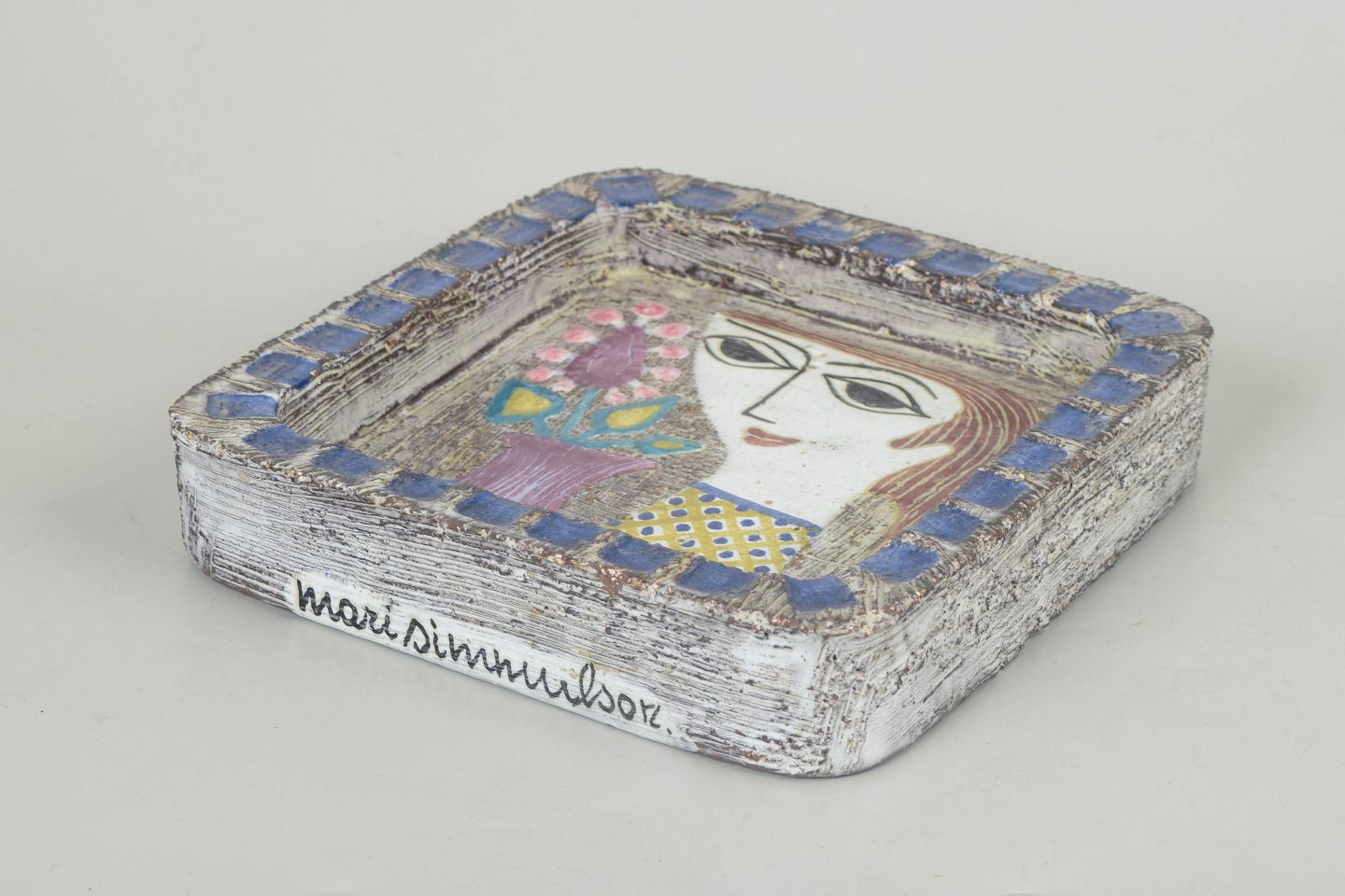 Kvadratisk keramikfad model 4156 med hånddekoreret motiv af stiliseret kvindeportræt og blomster i farverige nuancer, udført i glaseret lertøj.