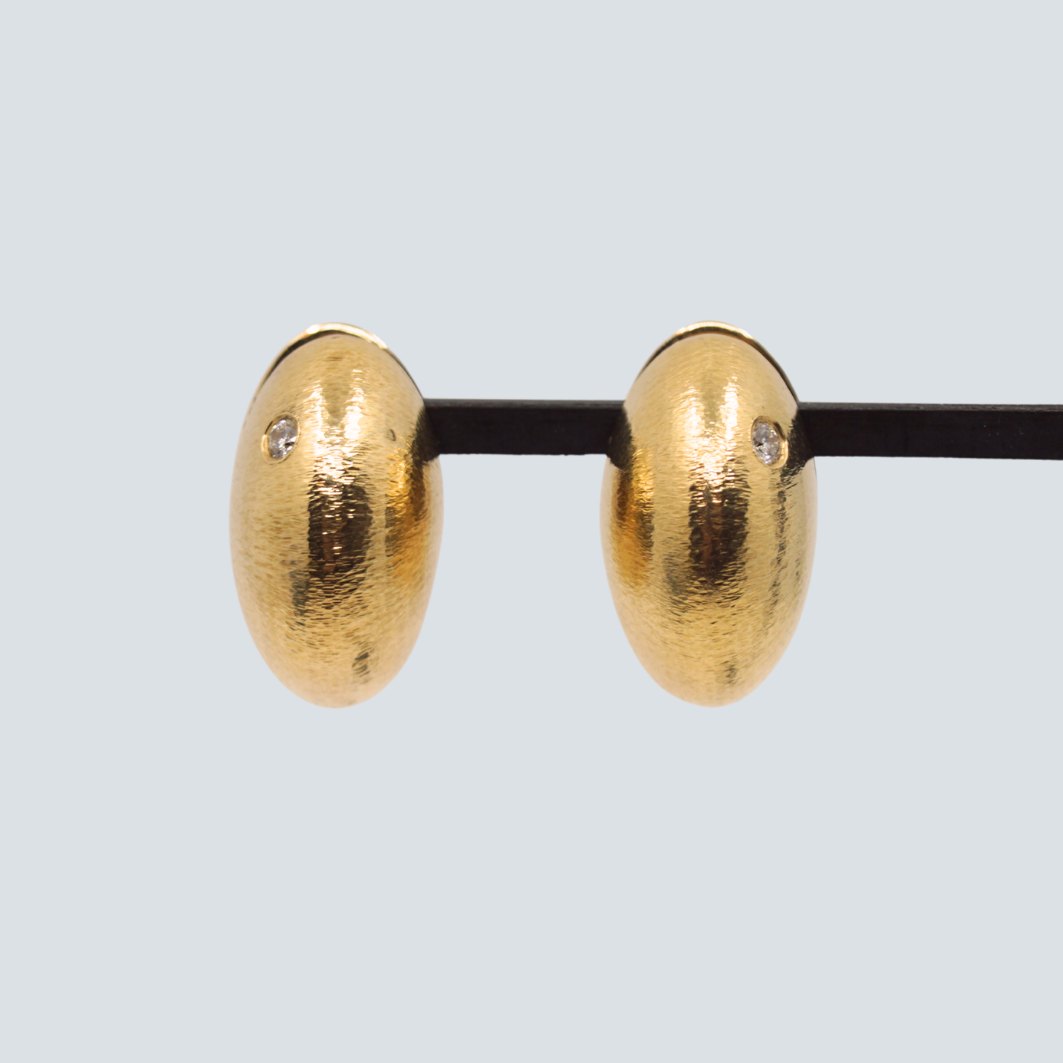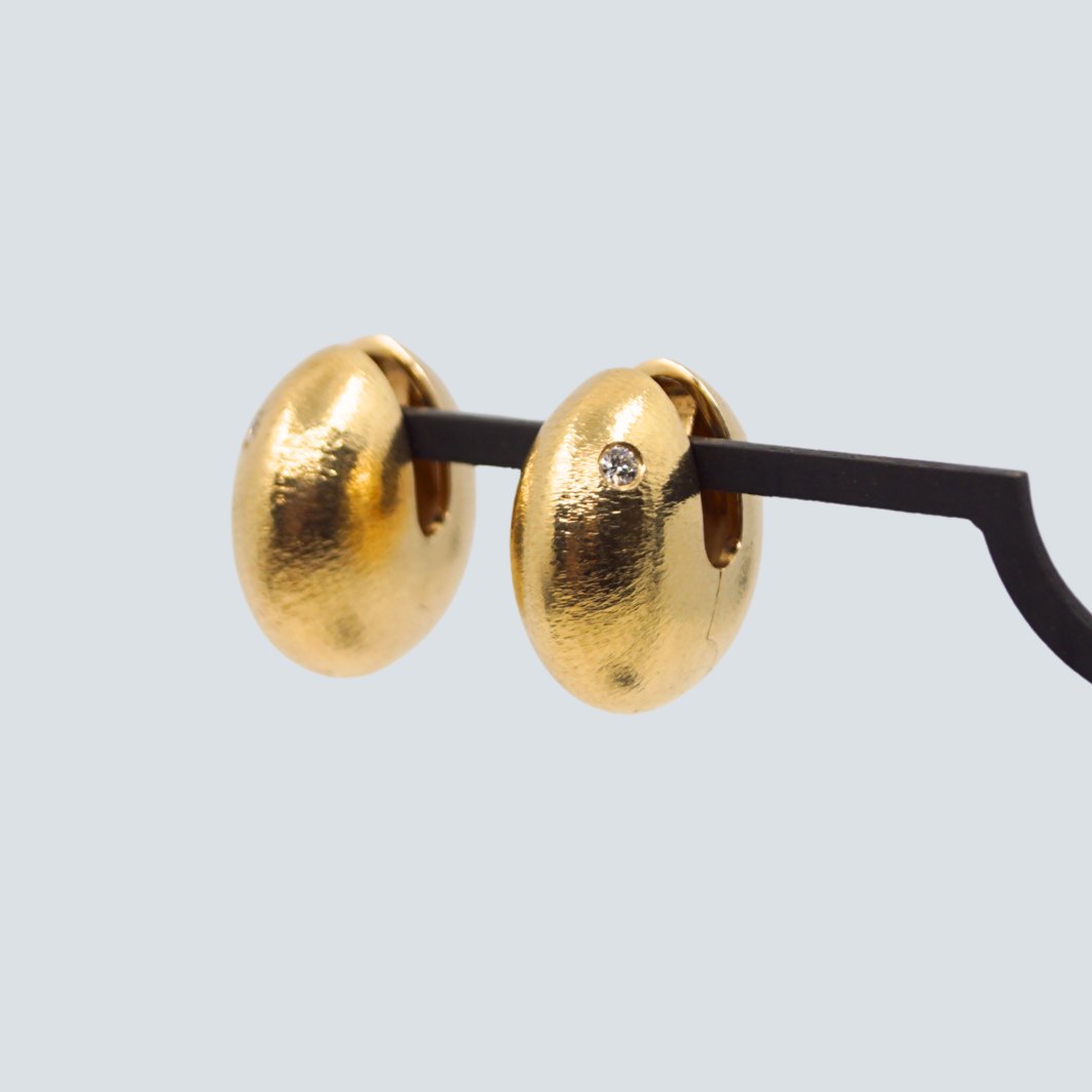 Text zugänglich auf Dänische: Ole Lynggaard par øreringe i 14 kt. guld. med riflet overflade. Sat med to diamanter, i alt 0.10 ct.