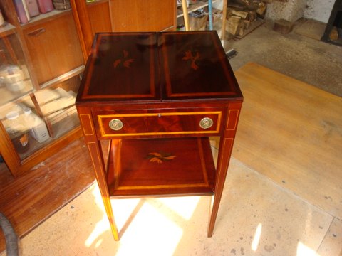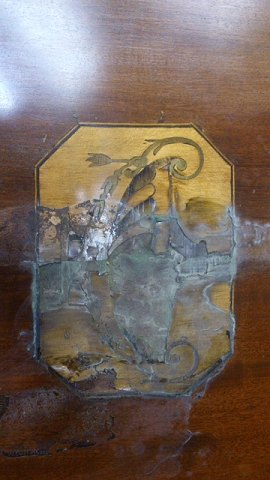 Der Tisch hatte einen Wasserschaden auf der Oberseite der Platte und an den Klappen. Wir haben den Tisch restauriert und neue Intarsien eingelegt. Siehe Foto vor und nach.