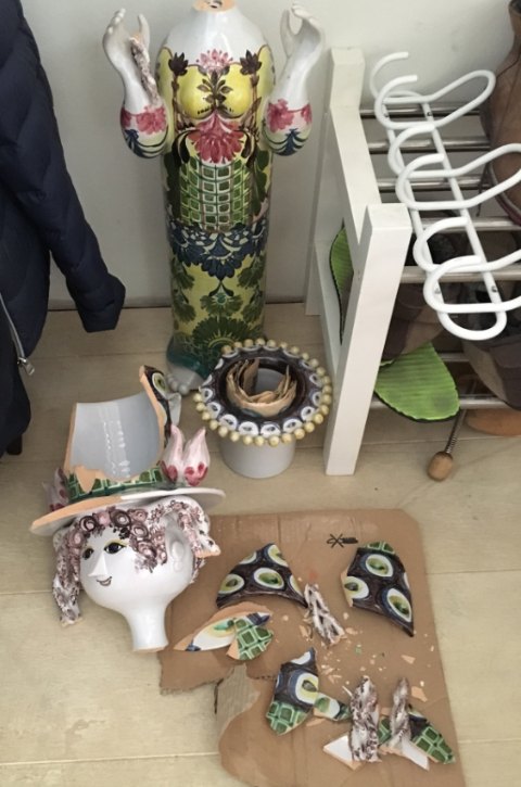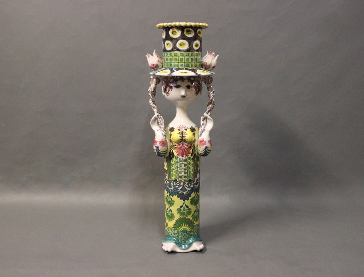 Diese große Bjørn-Wiinblad-Figur wurde repariert, nachdem sie in mehrere Teile zerbrochen war. Siehe Vorher- und Nachherbilder.