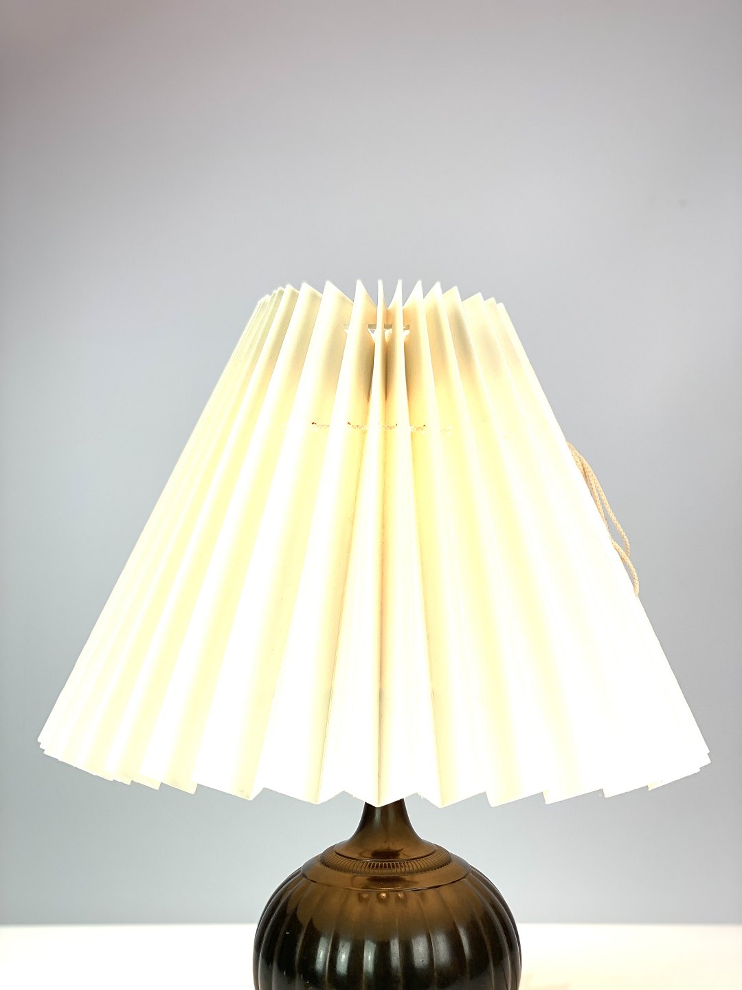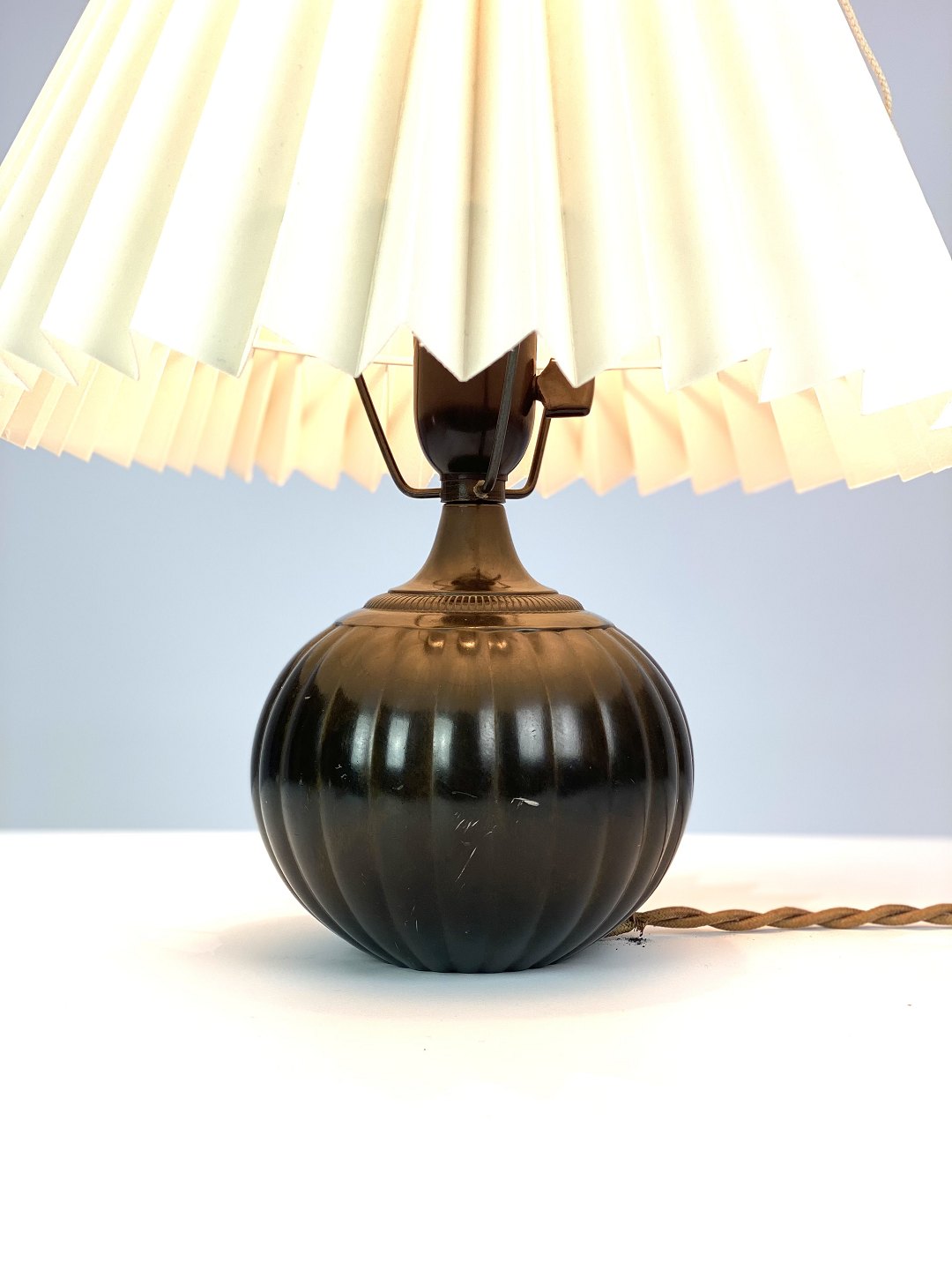 Tischlampe aus Diskometall von Just Andersen. Die Lampe befindet sich in sehr gutem Vintage-Zustand und mit einem Papierschirm.