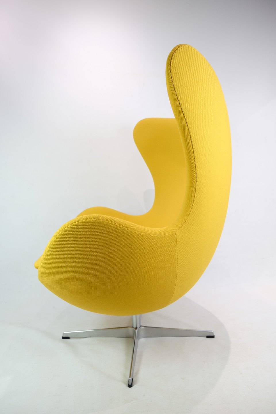 Wir haben eine sehr schöne Neupolsterung des Egg in einem currygelben Stoff von höchster Qualität vorgenommen. The Egg ist ein ikonischer Sessel, Modell 3316, entworfen vom berühmten dänischen Architekten und Designer Arne Jacobsen und hergestellt von Fritz Hansen. Der neue Stoff verleiht dem Sessel ein frisches und modernes Aussehen und bringt ihn auf den heutigen Stand in Bezug auf Stil.