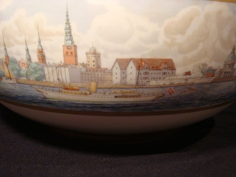 Schöne große Porzellanschale. Von der Königlichen Porzellanmanufaktur. Royal Copenhagen Festschrift Bowl 1775-1975. Mit gemalt Maersk Kontainer Schiff, die Royal Yacht Danebro, Kronborg, Schulschiff Dänemark und vieles mehr. Eine wirklich nette Bowl. Rc. Nr. 1508-2500, ist nur 2500 Exemplare gefertigt. Diese Nummer ist die 1508.
