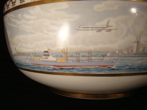 Schöne große Porzellanschale. Von der Königlichen Porzellanmanufaktur. Royal Copenhagen Festschrift Bowl 1775-1975. Mit gemalt Maersk Kontainer Schiff, die Royal Yacht Danebro, Kronborg, Schulschiff Dänemark und vieles mehr. Eine wirklich nette Bowl. Rc. Nr. 1508-2500, ist nur 2500 Exemplare gefertigt. Diese Nummer ist die 1508.