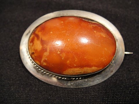 Broche med rav. Sølv Længde: 4,5 cm , Bredde: 3,5 cm Kontakt for pris