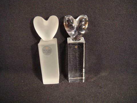To Holmegaard Hjerte lysestager. 1 stk. sandblæst glas. 1. stk. klar glas. Højde: 12,5 cm