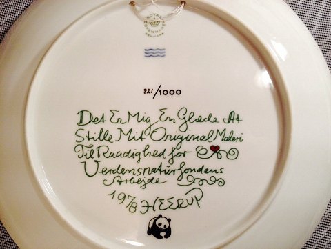 Royal Copenhagen, Heerup. Platte Nr. 821/1000. Für die Arbeit des WWF 1978 Design Eagle, Nashorn, Eisbär mit jungen und Dichtung.