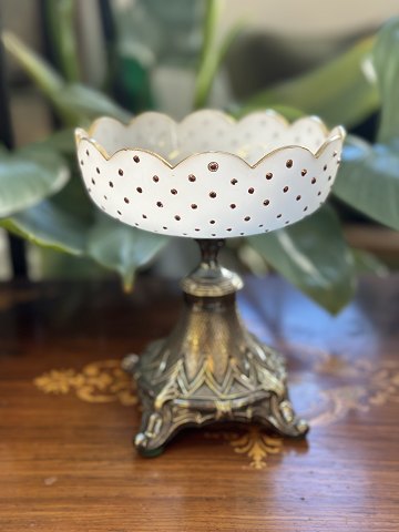 Vintage-Schale aus den 1800er-1900er Jahren, die Schale ist aus Opalglas (milchig weißes Glas) mit handgemalten goldenen Punkten und Goldrand, der Fuß ist versilbert mit dekorativen Jugendstil- und Barock-inspirierten Details, entworfenes Opalglas aus den späten 1800er Jahren