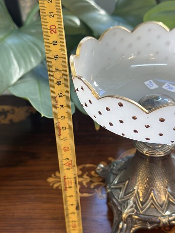 Vintage-Schale aus den 1800er-1900er Jahren, die Schale ist aus Opalglas (milchig weißes Glas) mit handgemalten goldenen Punkten und Goldrand, der Fuß ist versilbert mit dekorativen Jugendstil- und Barock-inspirierten Details, entworfenes Opalglas aus den späten 1800er Jahren