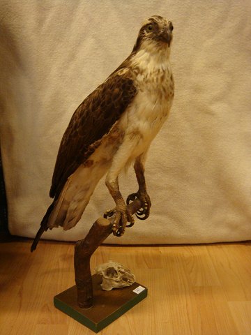 Udstoppet fiskeørn på stand med kranie. Aquila chrysaetos