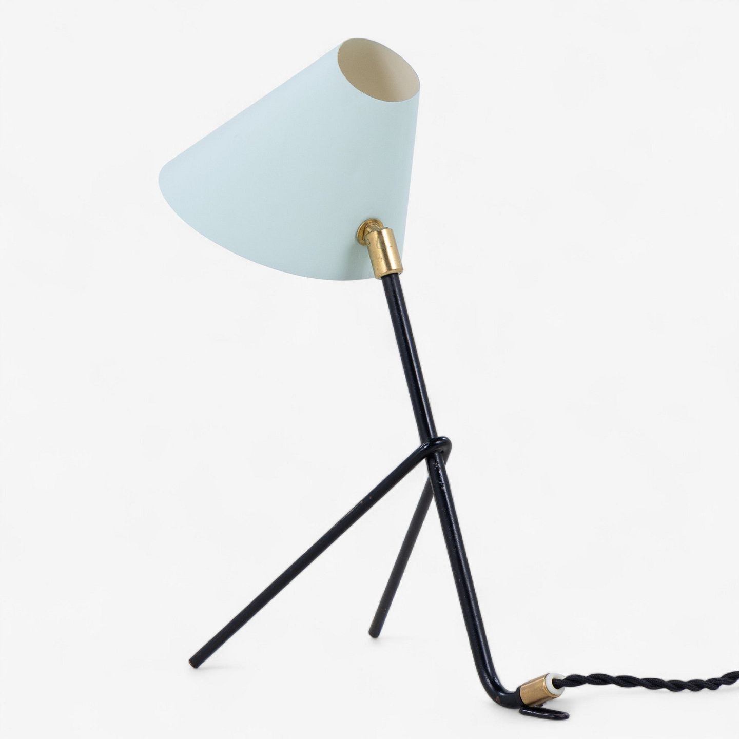 Bordlampe i sortlakeret metal med messing detaljer og blå skærm.