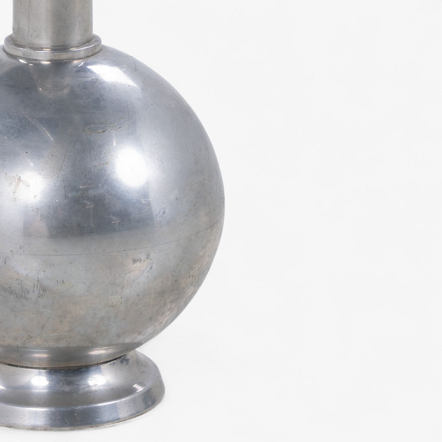 Kugleformet bordlampe i patineret tin uden skærm.