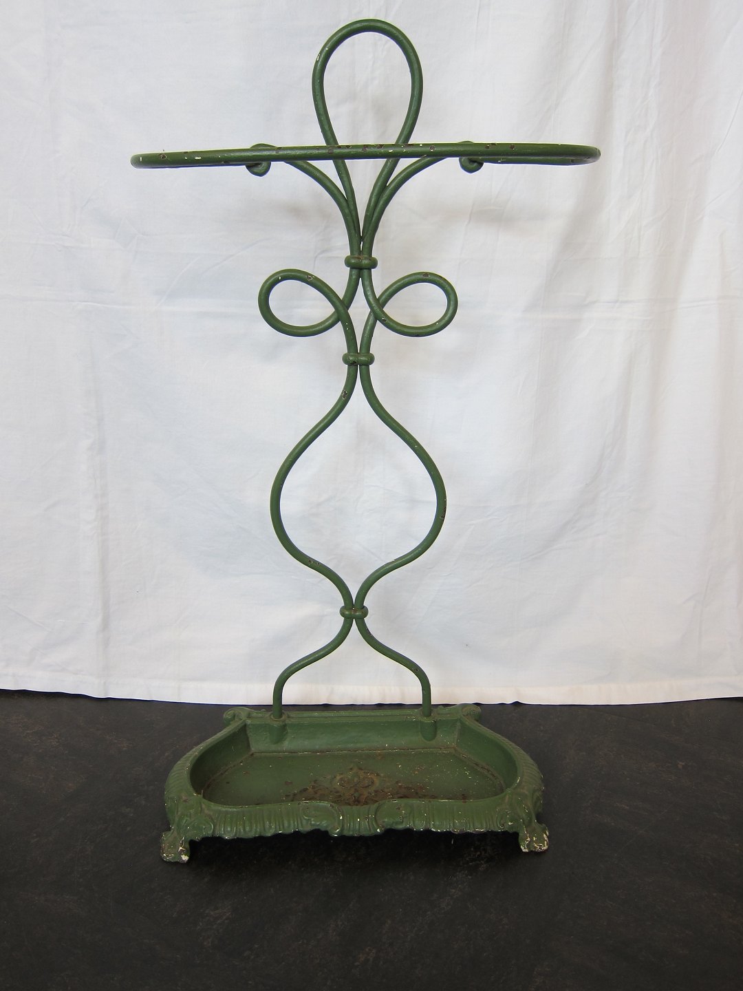 Schöner alter Schirmständer aus grüngemaltem Eisen mit schönen Formen und Dekorationen